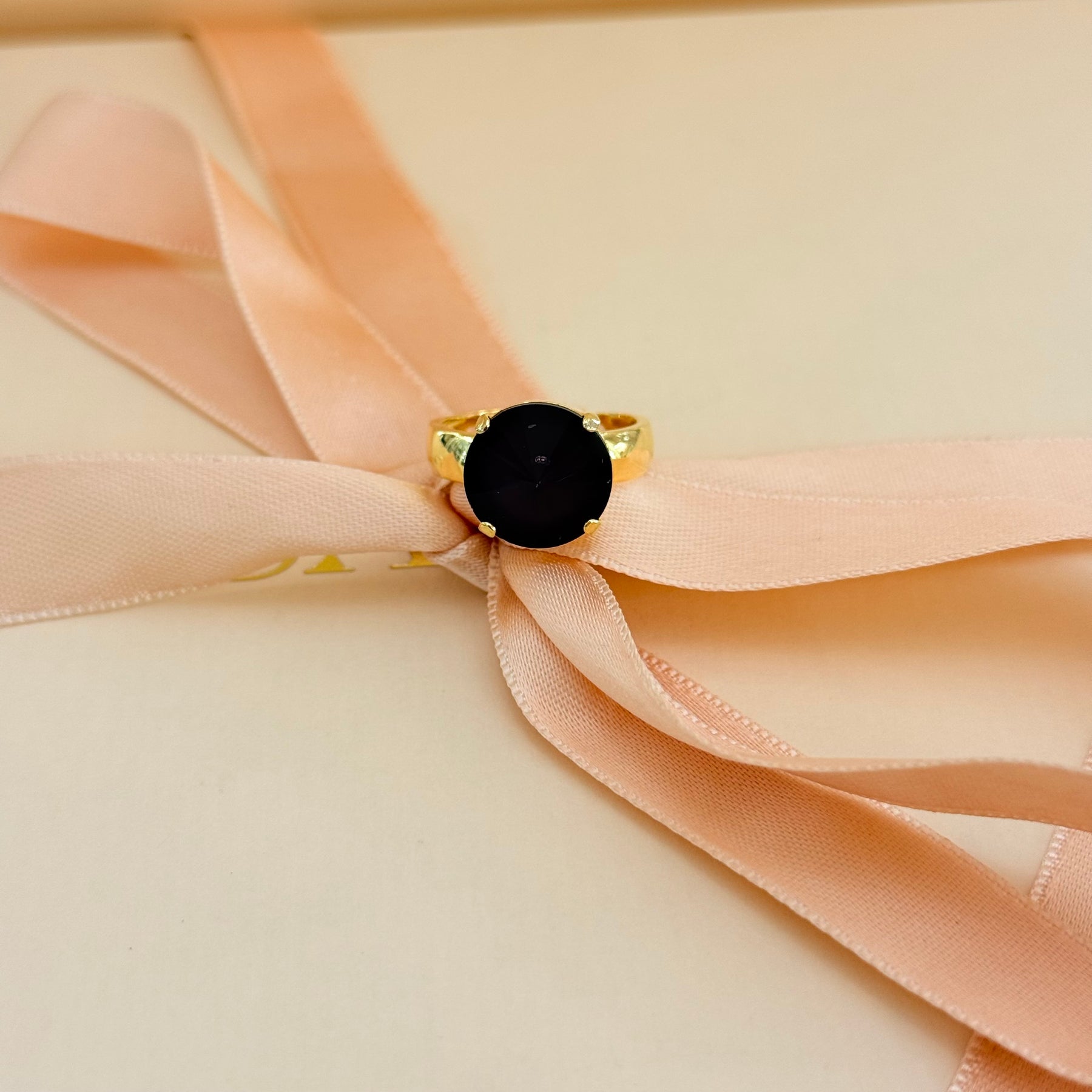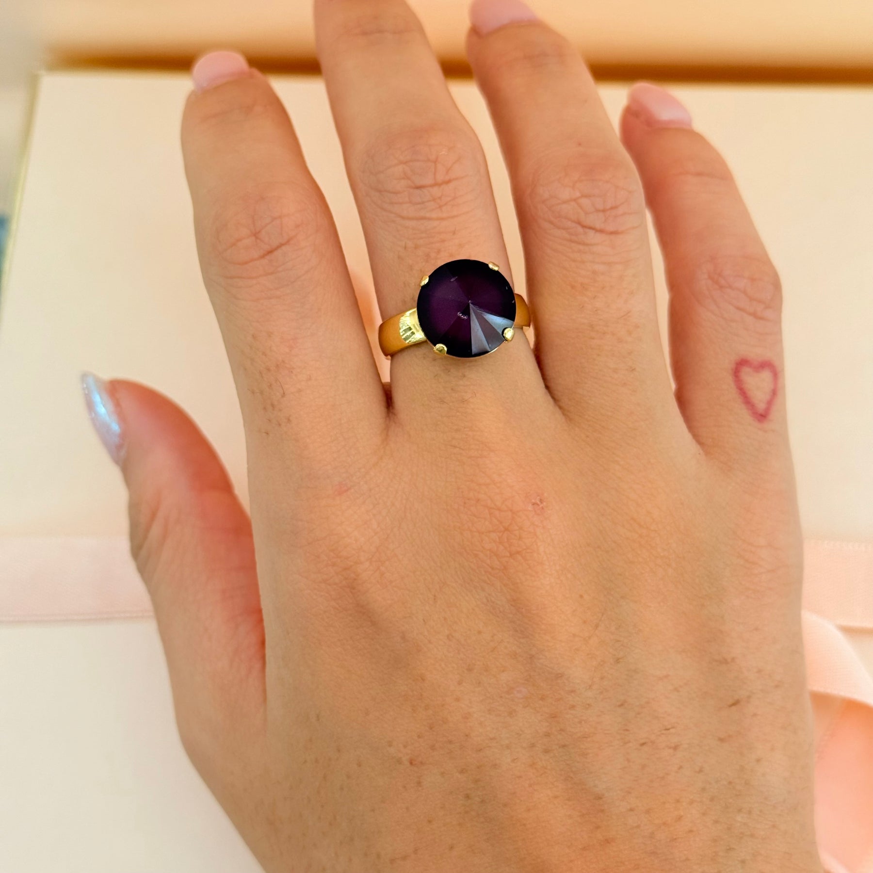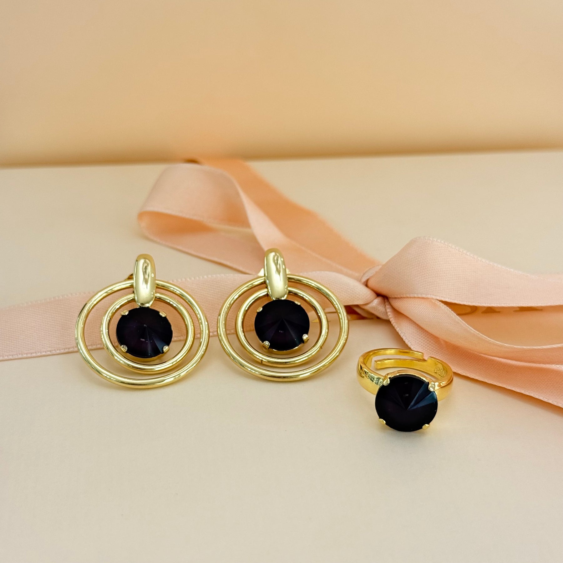 These statement plum Swarovski crystal earrings and ring offer both elegance and versatility with their gold plated design. Adorned with high quality crystals, they make a stunning addition to any outfit. A must-have for those seeking a touch of glamour.