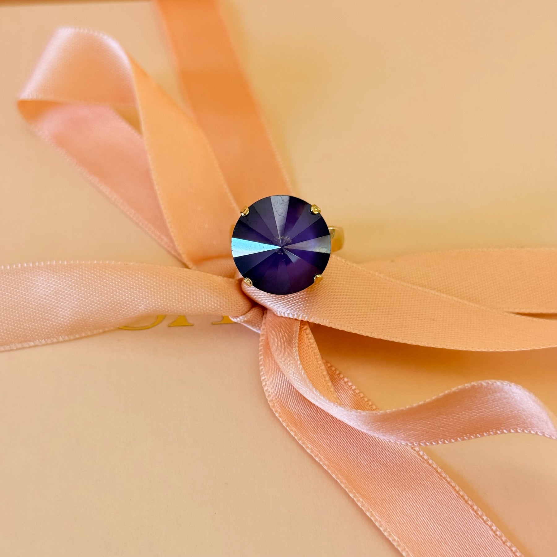 Indulge in luxury with our round purple Swarovski crystal earrings and ring. The dangling crystals add a touch of elegance to any outfit, while the gold plating ensures long-lasting quality. Perfect for any occasion, these high-quality crystal earrings are a must-have addition to your collection. New and ready to elevate your style!