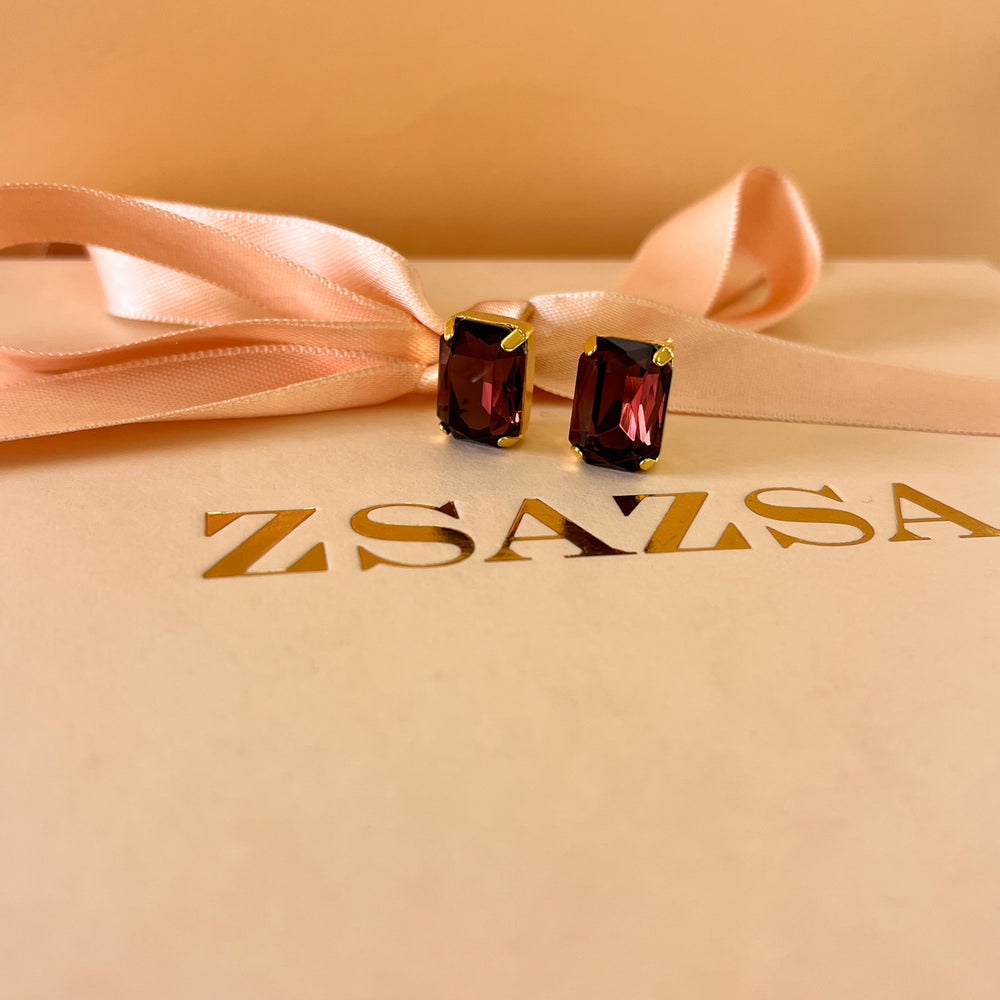 Purple rectangular preciosa crystals studs and ring