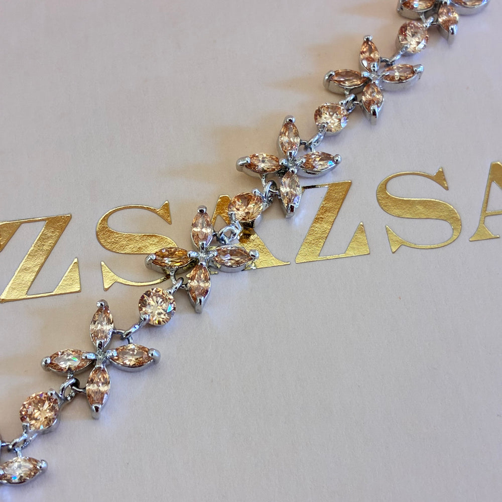 Get ready to add a touch of sweetness and charm to your outfit with our Flower Peach Zircone Silver Bracelet. The beautiful peach zircone stones mimic delicate flowers, creating a sweet and nice accessory that will elevate any look. Treat yourself or someone special to this lovely bracelet today!
