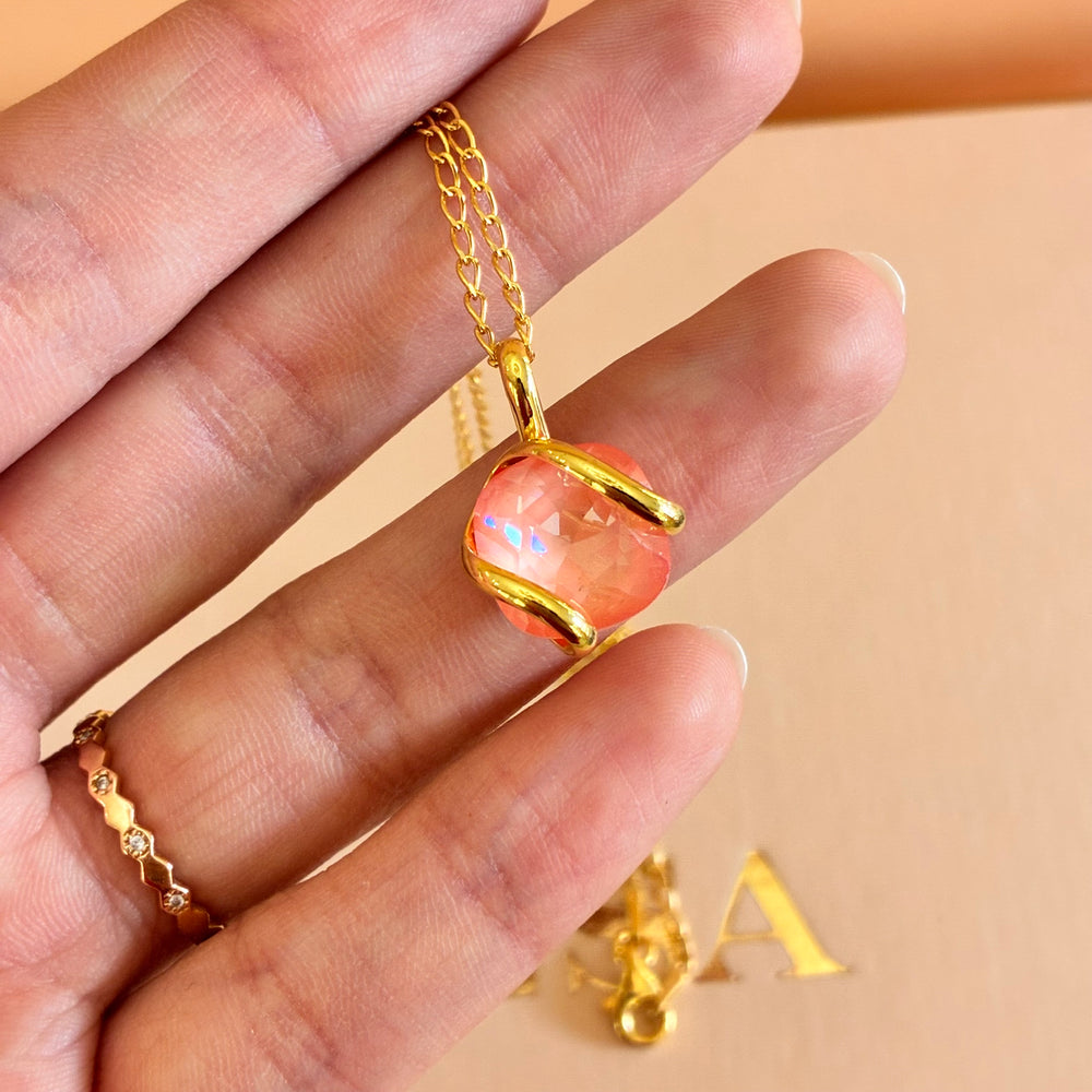 Create a sophisticated look with our Murano Peach pendant set in gold plated. The dainty and elegant pendant features an eye-catching peach murano stone, making it the perfect accessory for any occasion. Upgrade your style and stand out with this unique pendant set.