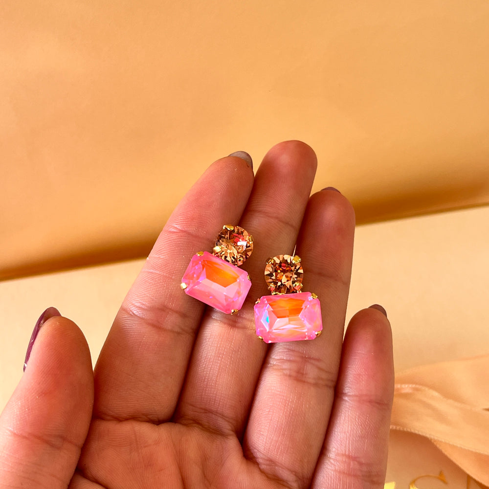 These gold-plated stud earrings feature a stunning combination of peach and pink neon Swarovski crystals in both round and rectangular shapes. Their vibrant colors add a fresh and elegant touch to any outfit, while the secure studs ensure comfortable all-day wear. Perfect for adding a subtle yet eye-catching sparkle to your look.