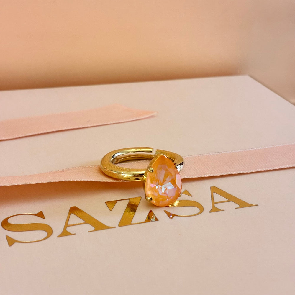 Experience the perfect blend of classic and elegant with our Teardrop peach Swarovski crystals ring. Adorned with a peach teardrop and sparkling Swarovski crystals, this gold-plated ring is also adjustable for the perfect fit. Make a statement that exudes passion and sophistication.