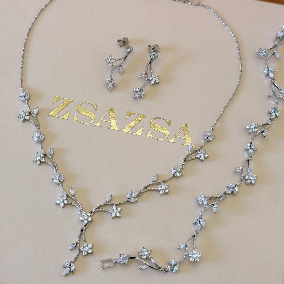 Flower and leaves zircone silver set