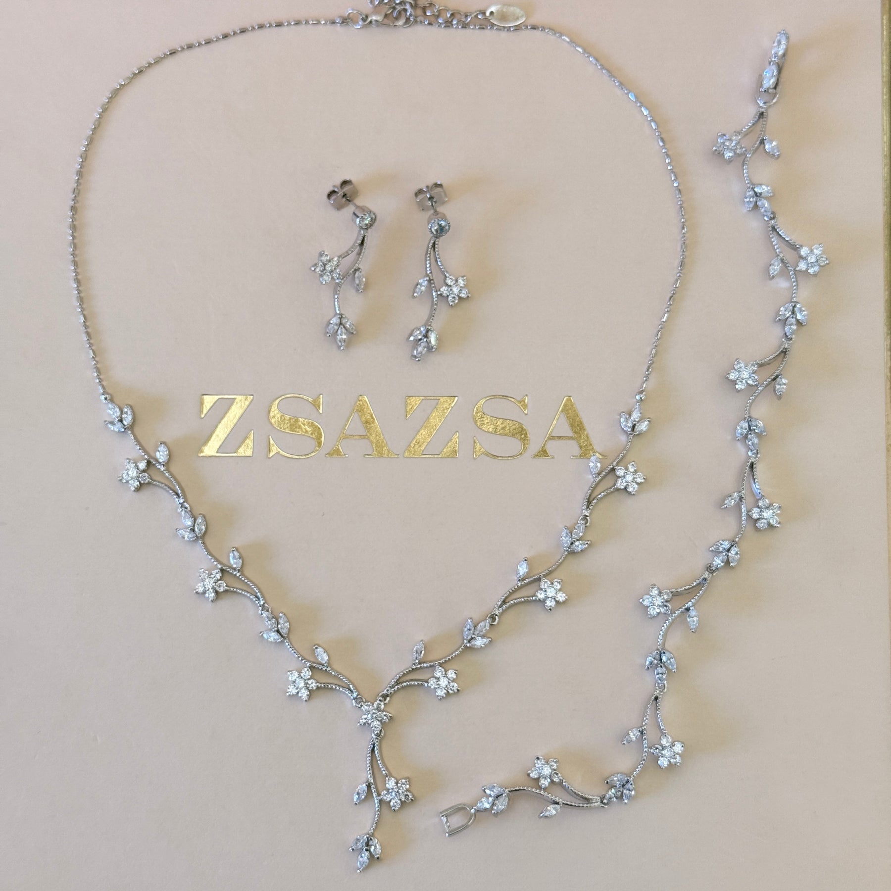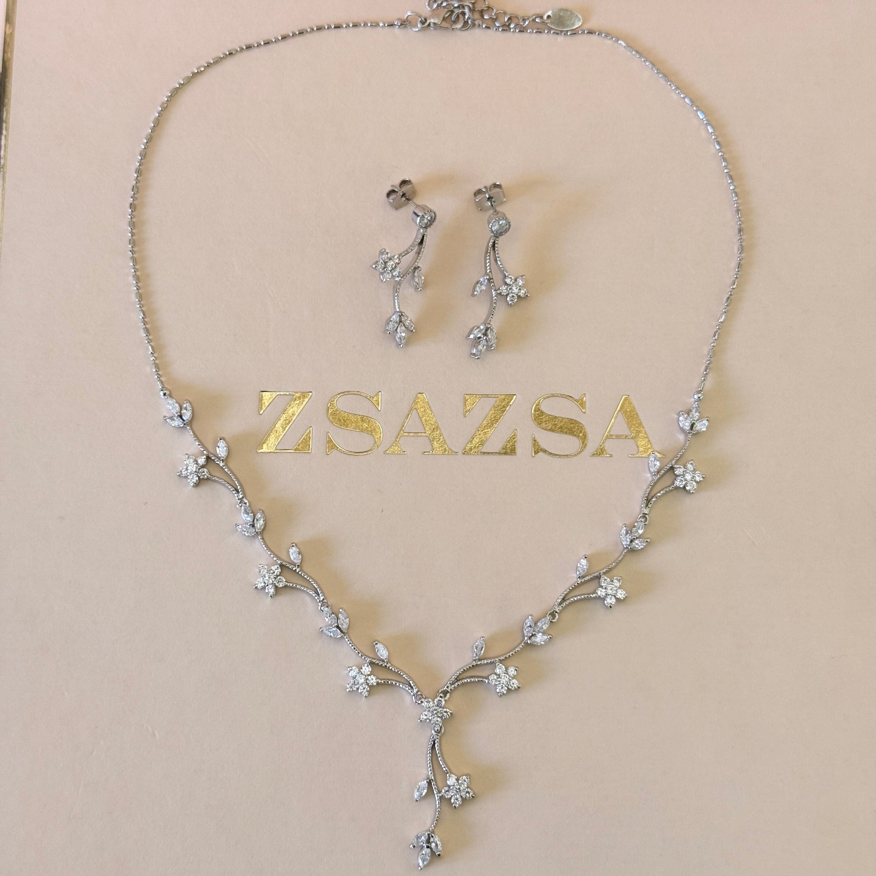 The Flower and Leaves Zircone Silver Set features intricately designed zircon-encrusted floral and leaf elements, elegantly plated in white gold. This set is ideal for weddings, offering a sophisticated touch to formal attire. Its delicate craftsmanship ensures a refined aesthetic while maintaining durability for long-lasting wear.
