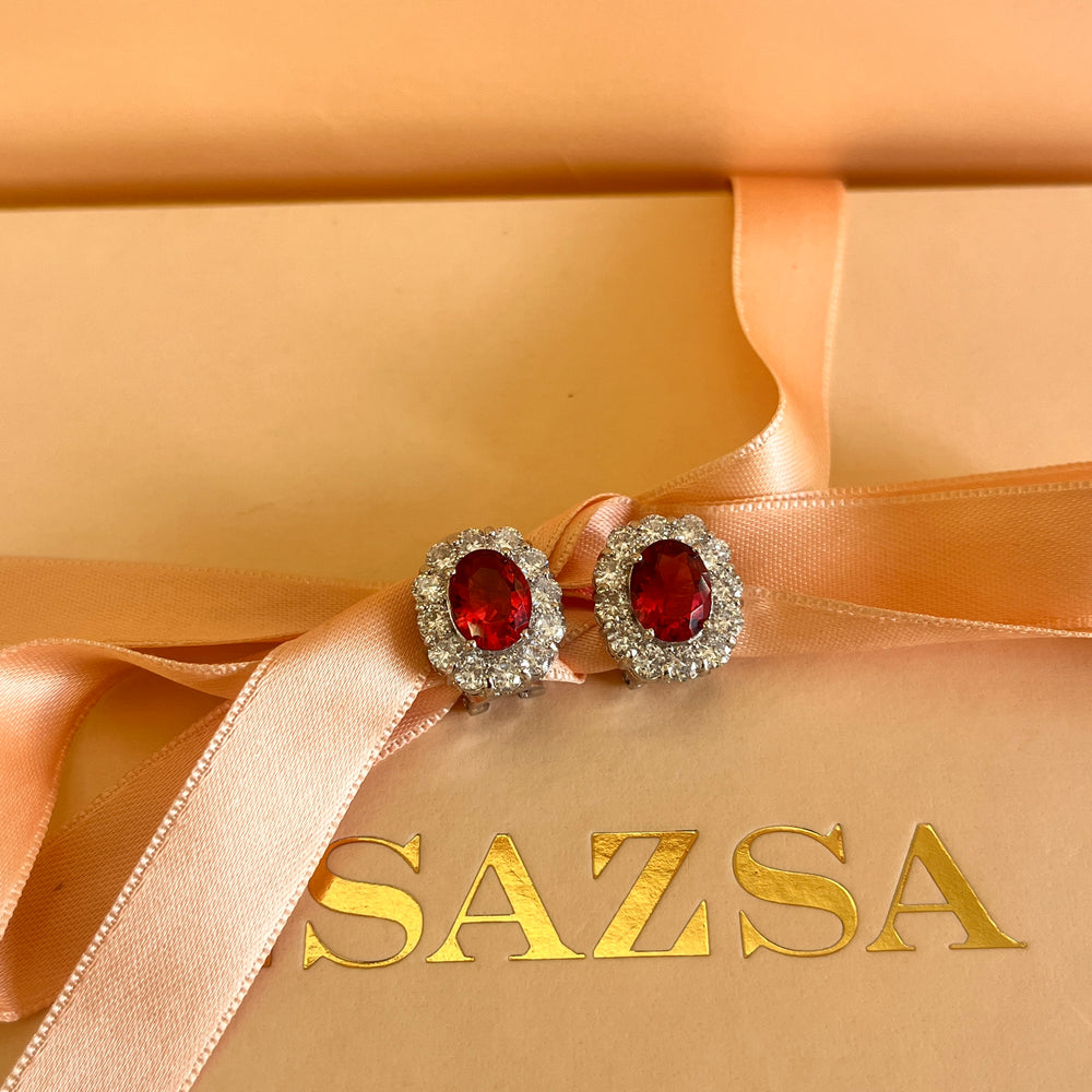 Zircone magenta and clear stones french clip stud earrings with matching pendant and ring set on a silver background.