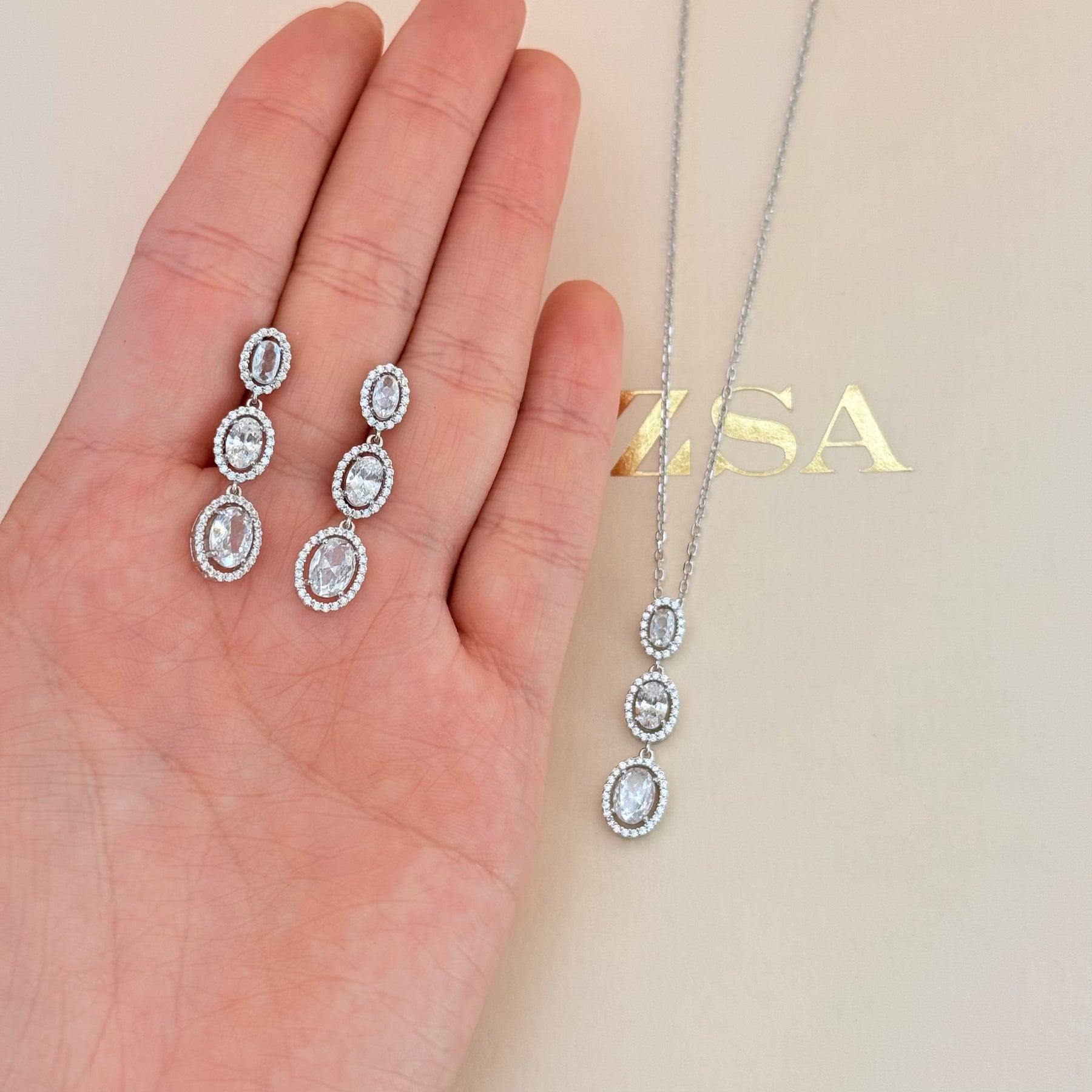 Elevate your bridal look with this elegant oval zircone sterling silver set. Perfect for weddings, its timeless design adds a touch of sophistication, ensuring you shine on your special day. This beautiful set not only enhances your outfit but also creates cherished memories as you celebrate love.