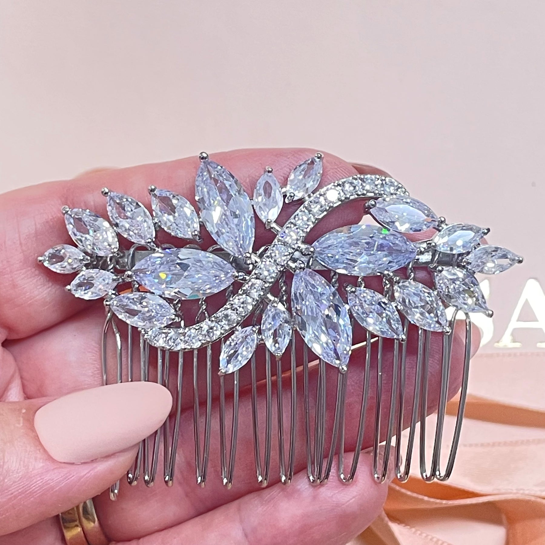 This elegant silver hair comb features marquise shaped cubic zirconia, adding a touch of glamour to any upstyle for special occasions and events. Elevate your hair game with this stunning accessory.