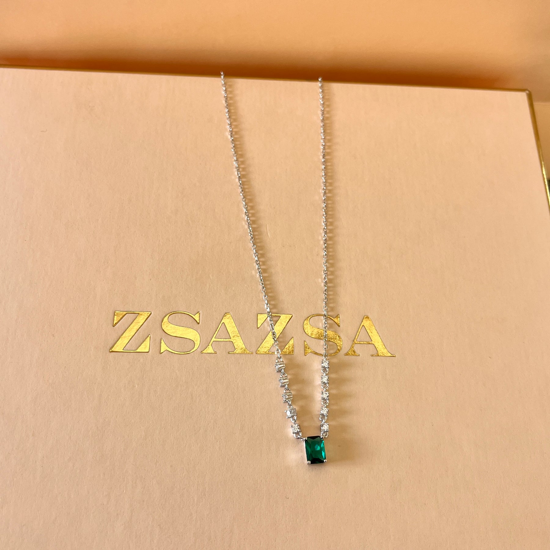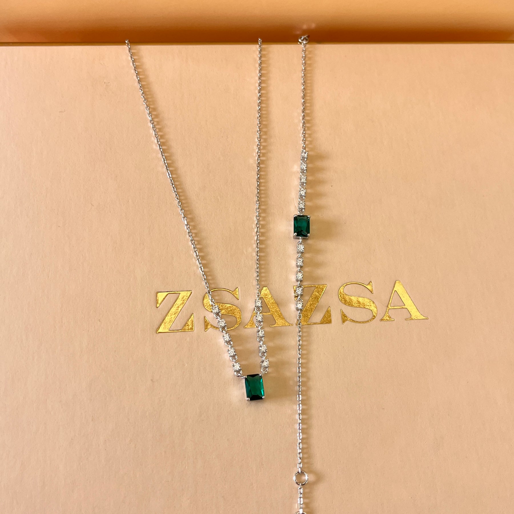 Fall in love with our luxurious dark green rectangular Zircon pendant and bracelet! Made with sterling silver 925, this set features brilliant red rectangular-shaped zircon stones. The dainty style adds a touch of elegance, while the pendant and bracelet offer versatility to your wardrobe. Indulge in the beauty and versatility of this stunning set today.
