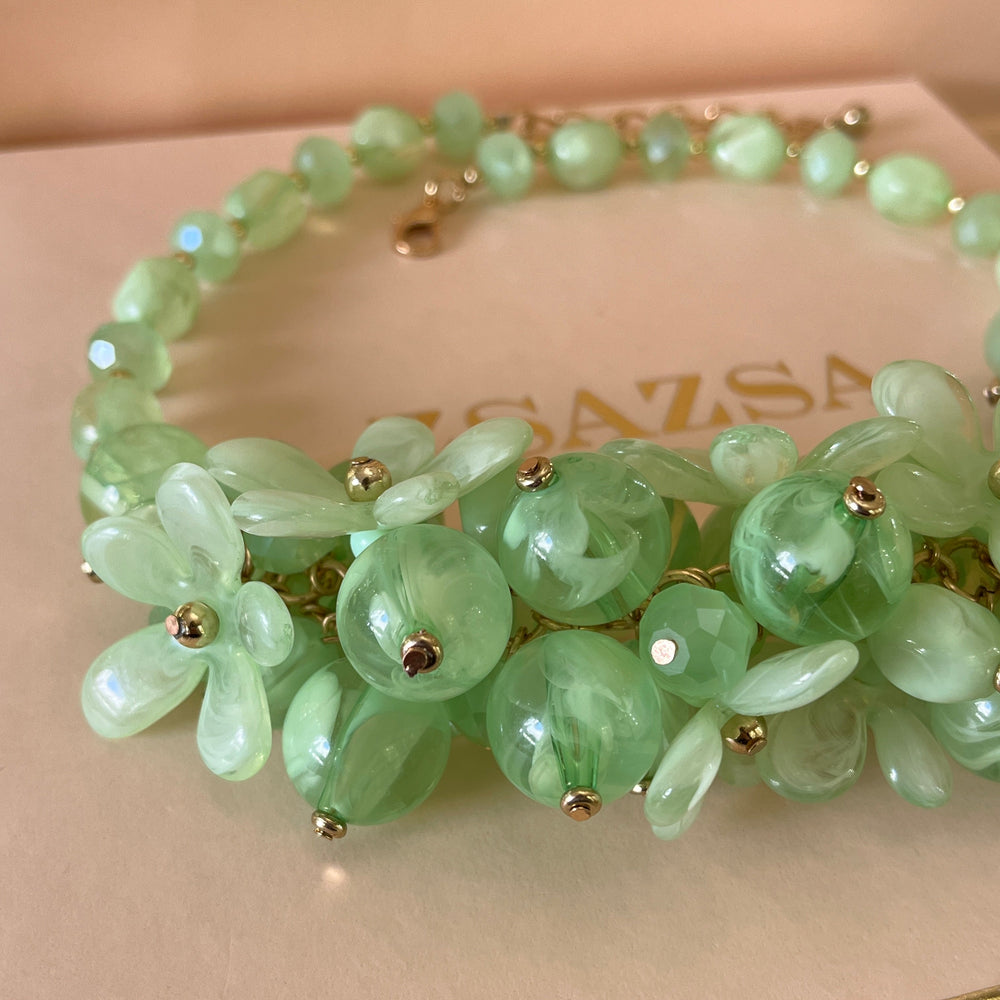 Light green statement flowers & balls necklace made with stainless steel and resin.