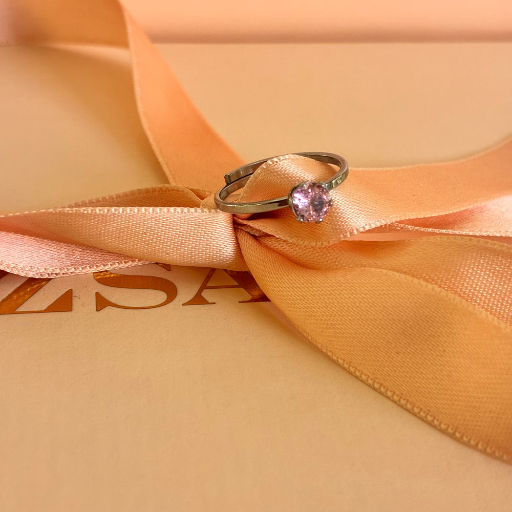 Elevate any outfit with our Solitaire light pink stainless steel ring. Its dainty design and adjustable fit (size 7-9) make it the perfect accessory for any occasion. Crafted from durable stainless steel, this ring adds a touch of elegance with a touch of playfulness.