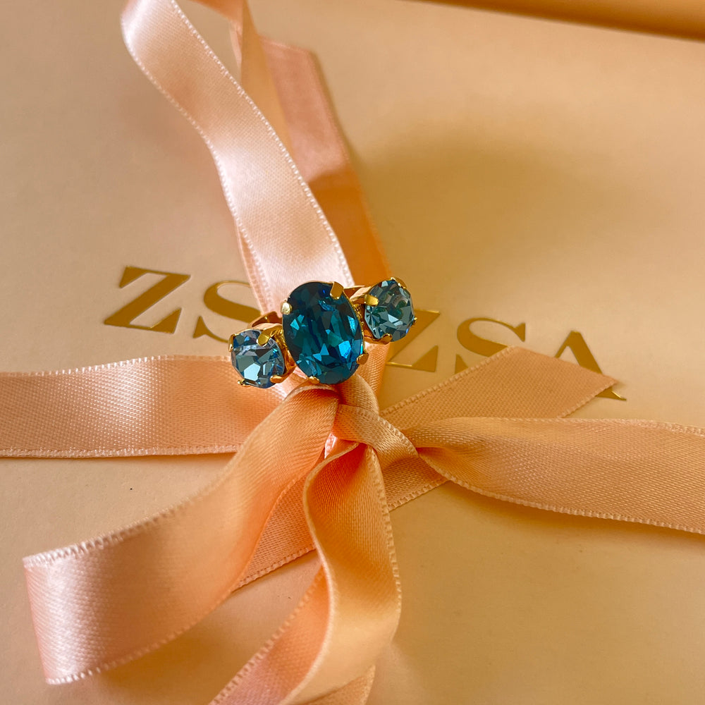Indulge in the captivating beauty of our Turquoise Preciosa Crystals Ring! Crafted with a luxurious gold plating, this adjustable ring boasts a stunning combination of a turquoise teardrop crystal and sparkling round crystals in a trilogy design. Elevate any outfit and make a statement with this must-have accessory!
