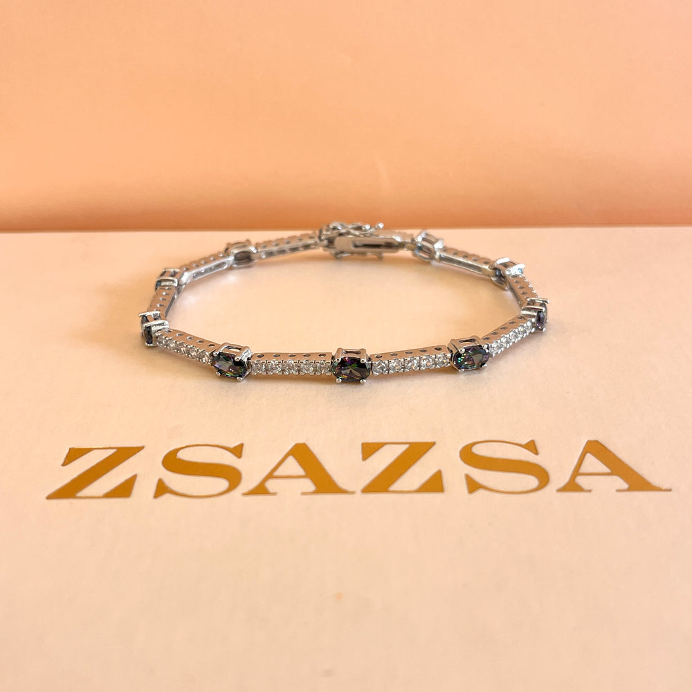 This stunning watermelon bracelet features sparkling zircones set in sterling silver for a glamorous and sophisticated look. The oval-shaped stones and tennis bracelet design make it a unique and eye-catching piece of jewelry. Add the perfect touch of elegance and style to any outfit with this beautiful watermelon bracelet.