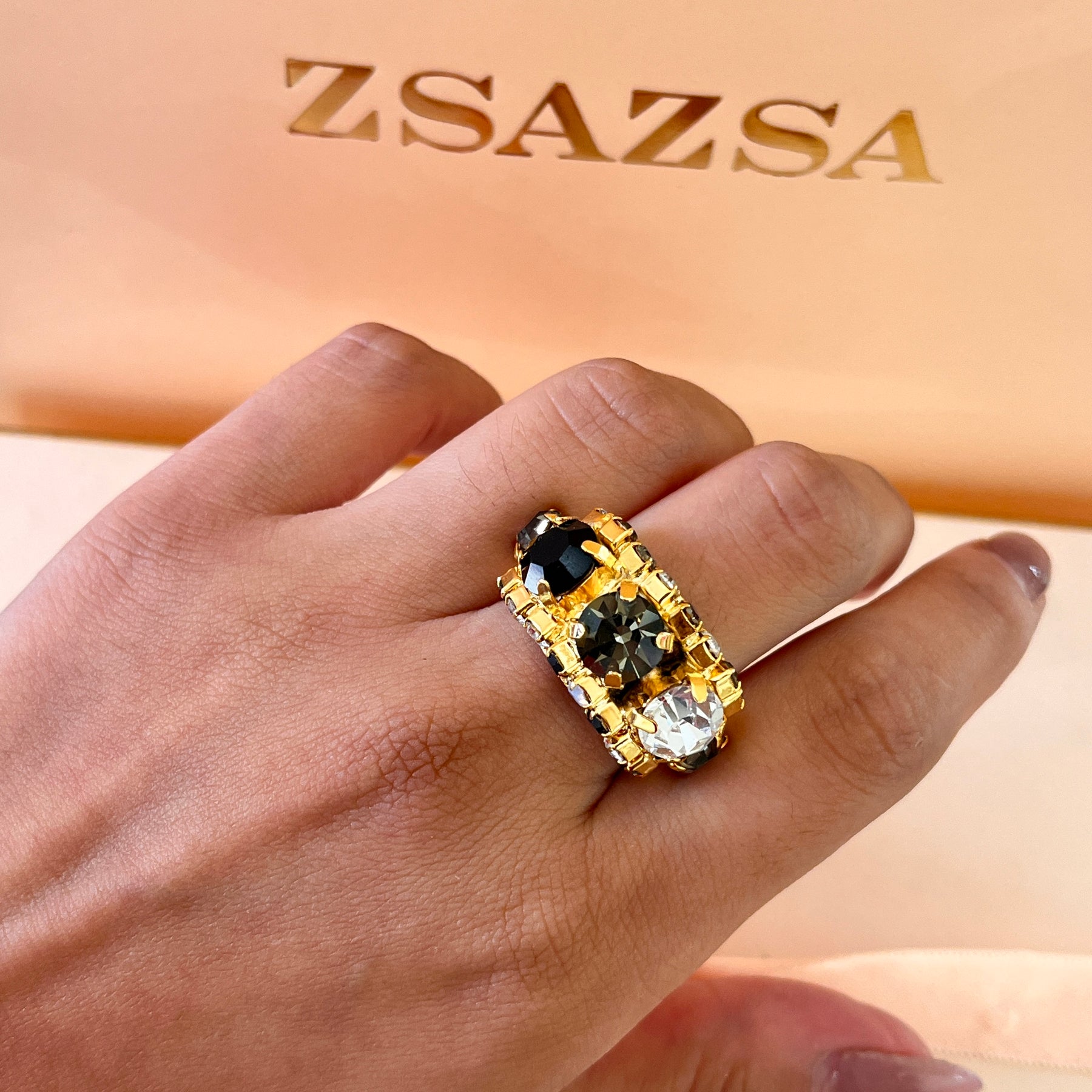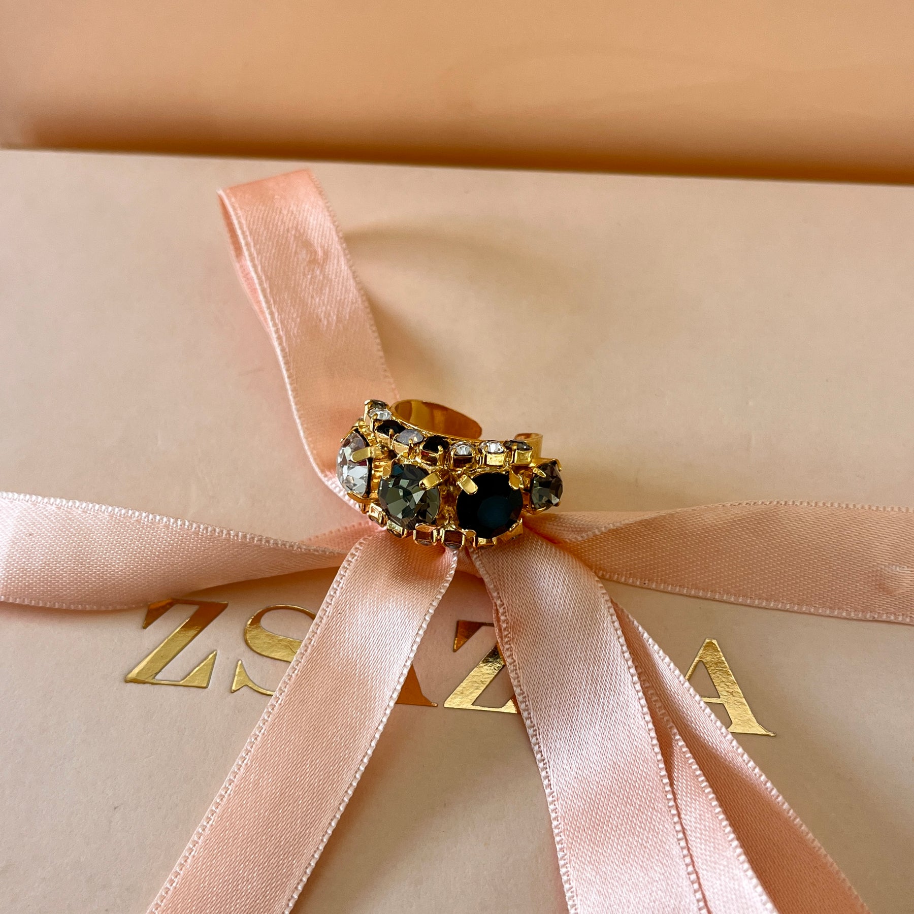 This grey and black preciosa crystal open band ring is the perfect accessory for any occasion. With its gRey and black  preciosa crystals and band ring style, it adds a touch of elegance to any outfit. The adjustable and gold-plated design make it a versatile piece that can be worn on any finger. Elevate your style with this stunning ring!