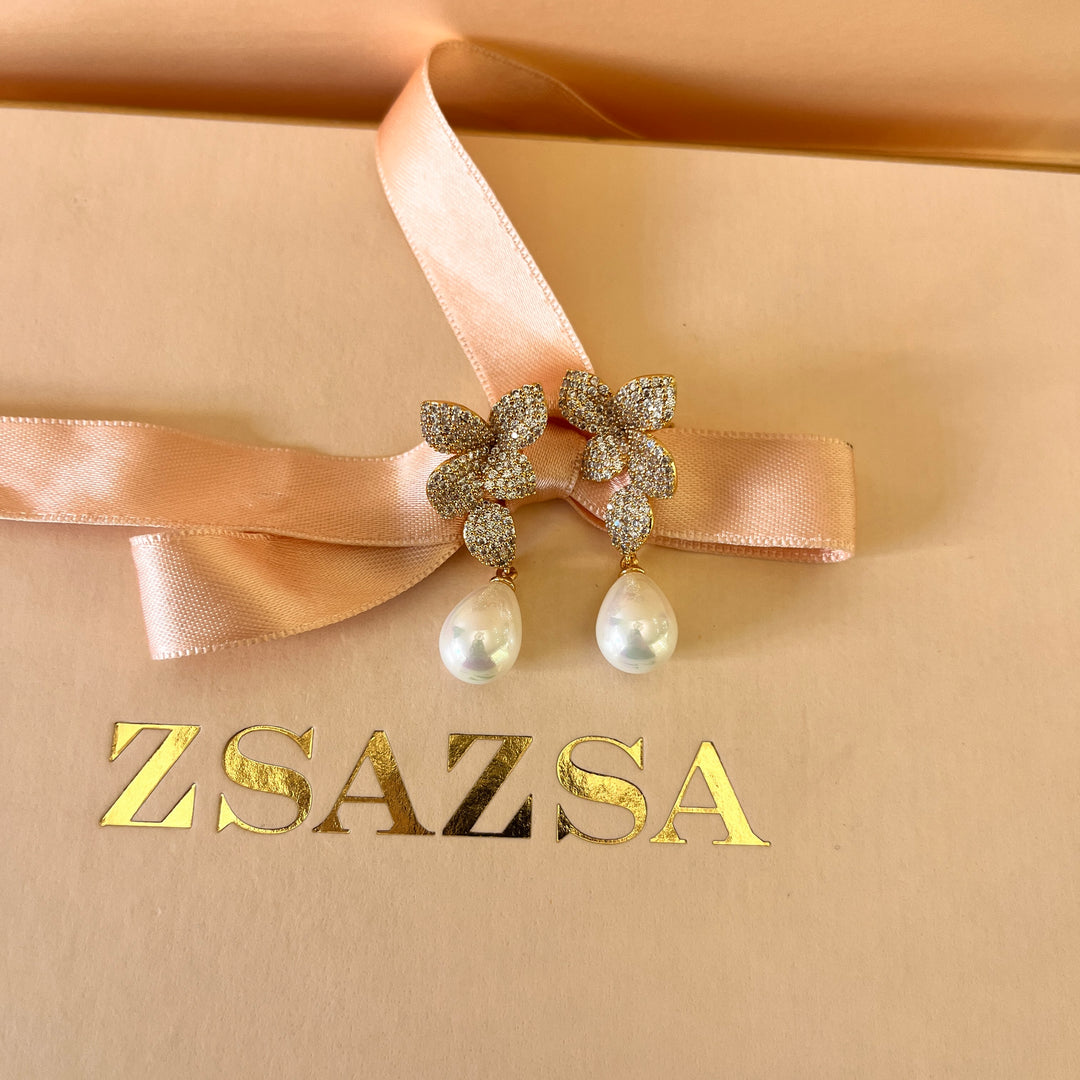 Flower zircone and pearls gold plated earrings