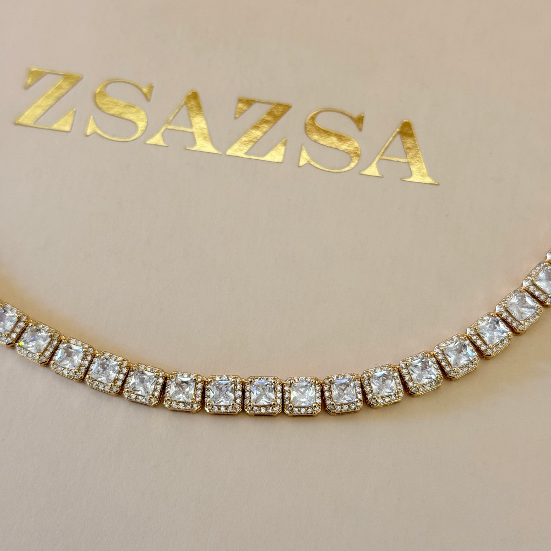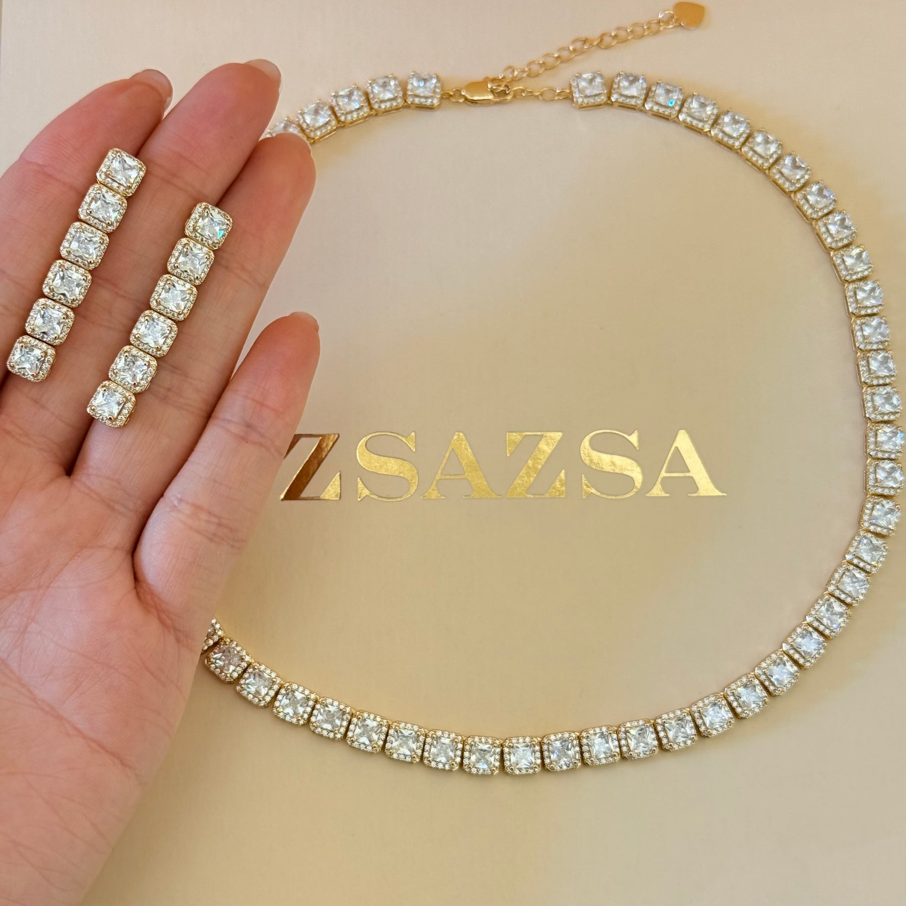 The Square Zircone Gold Plated Set features intricately designed square zircones, enhancing its classic and elegant aesthetic. Ideal for weddings, this set is suitable for brides and mothers of the bride or groom. Its gold plating ensures durability and a refined appearance, making it a timeless addition to formal attire.