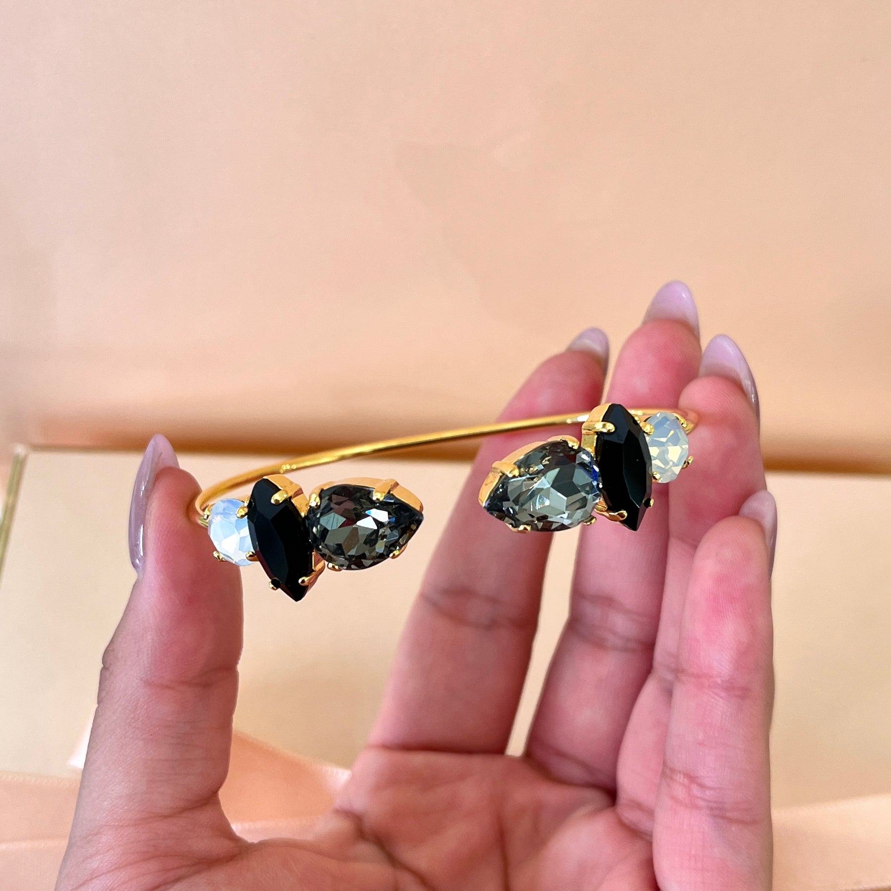 Indulge in luxury with our open and flexible gold plated bangle adorned with grey, black, and white preciosa crystals. The striking mix of shapes adds a touch of unique elegance to any outfit. Elevate your style and quality with this versatile accessory.