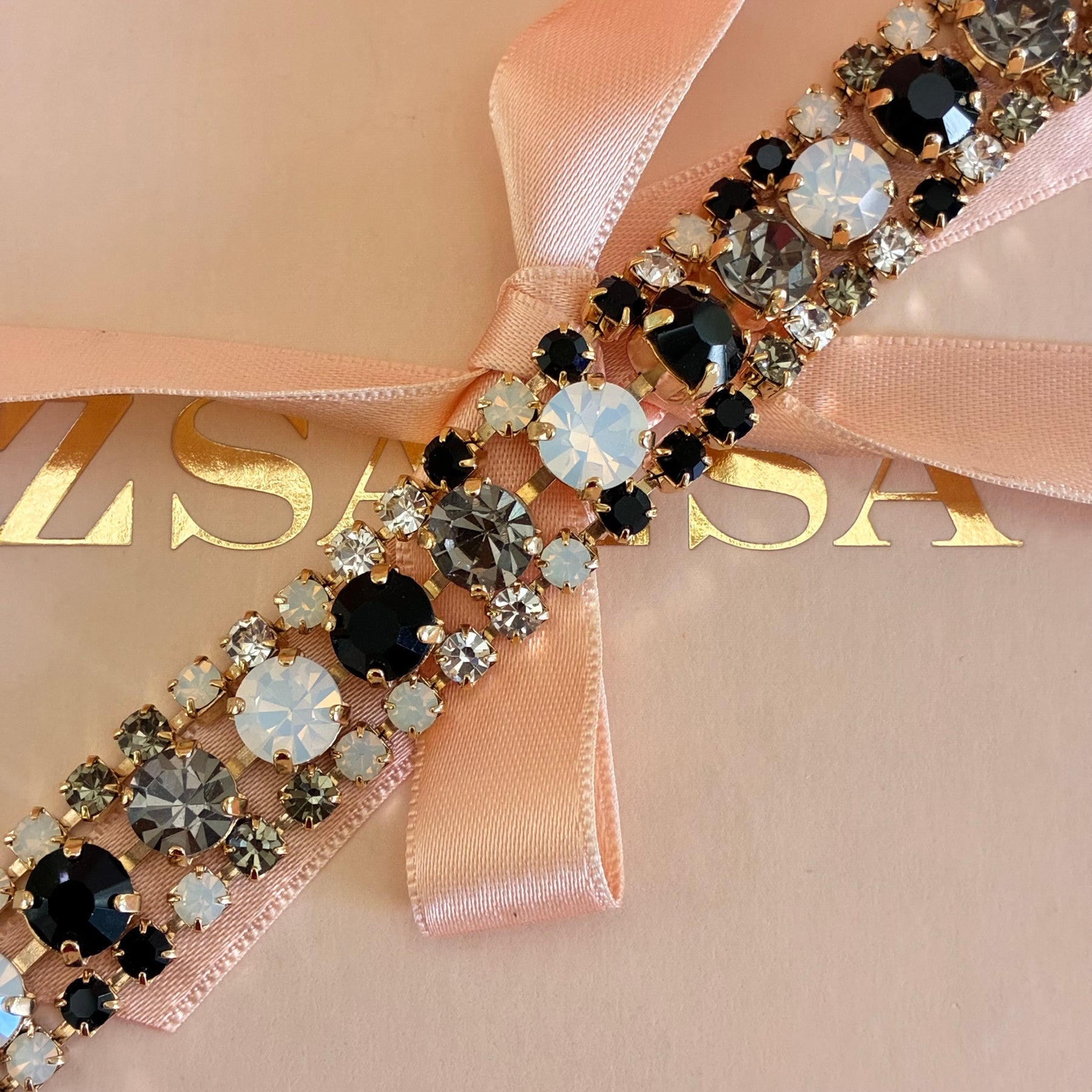 Elevate your style with our Black, White and Grey Preciosa Crystals Bracelet. This elegant piece is delicately crafted with gold plating and features stunning black, white, and grey crystals. Its slightly thicker design adds an extra touch of sophistication to any outfit. Add this bracelet to your collection and make a statement.