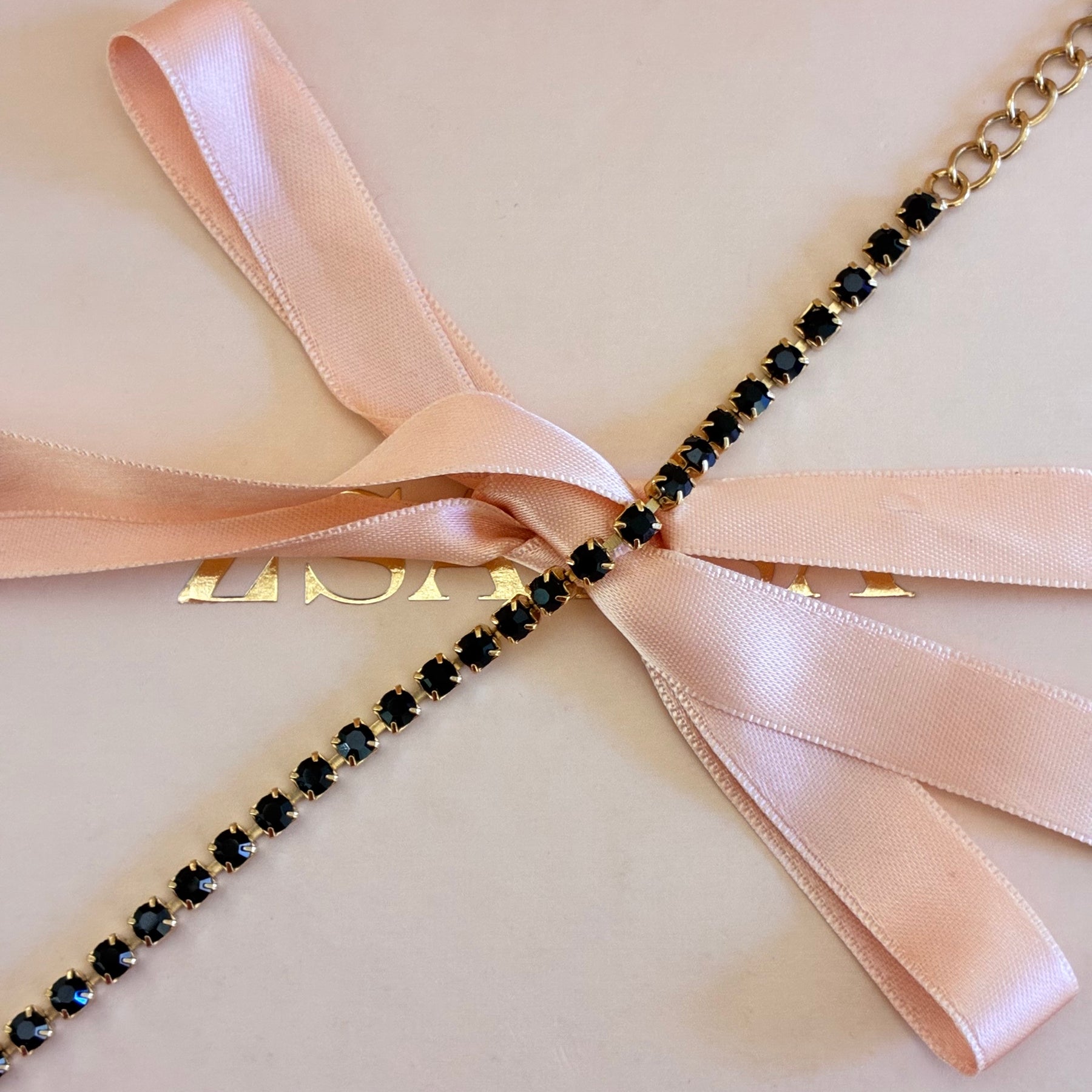 Elevate your style with our dainty Black Preciosa crystals bracelet. Made with genuine Preciosa crystals and intricately crafted in a delicate gold plated design, this bracelet adds a touch of elegance to any outfit. Stand out in a sea of ordinary with this must-have accessory!
