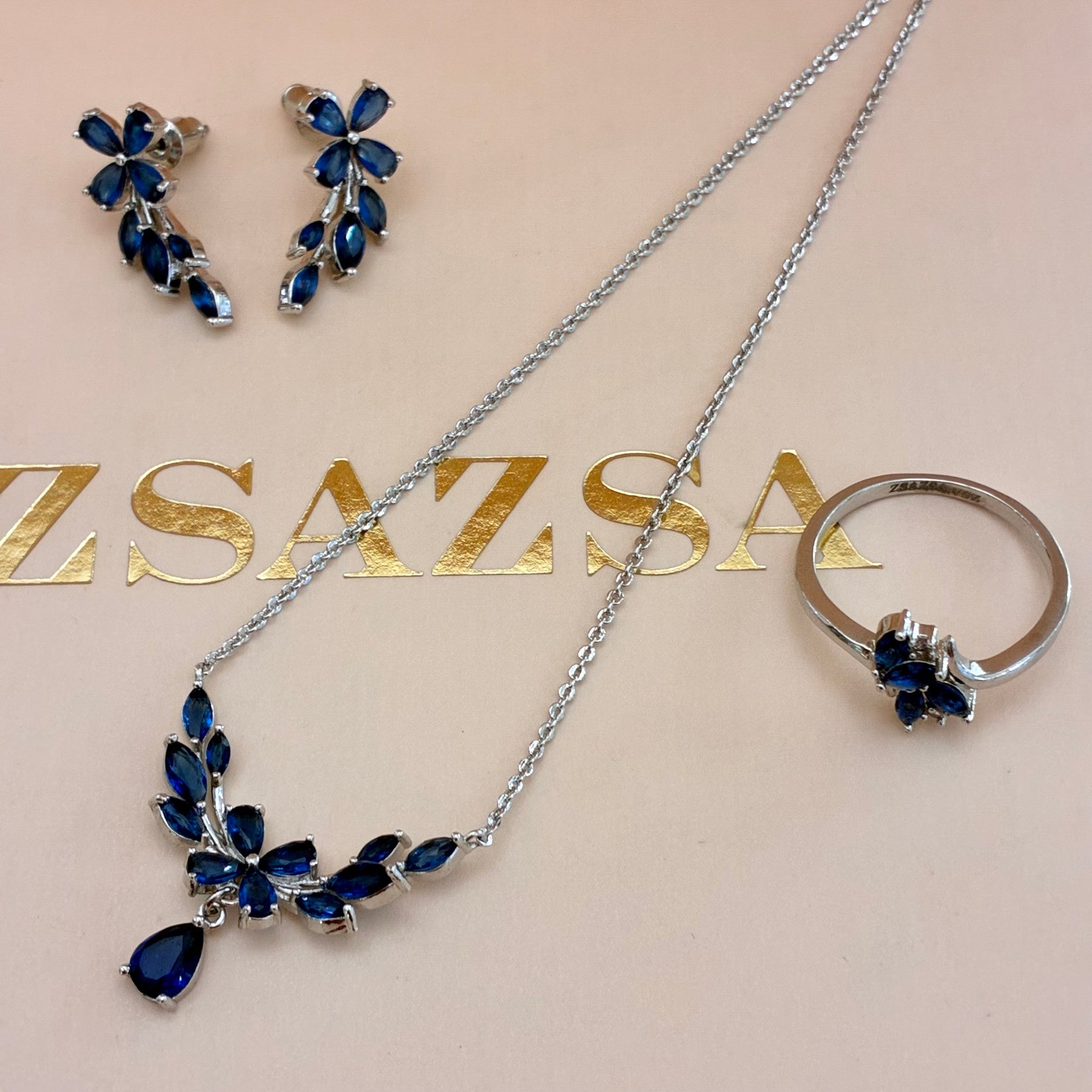 This elegant navy blue flower white gold plated set features dainty navy blue zircones, creating a stunning and sophisticated look. The silver setting adds a touch of timeless charm to any outfit. Elevate your style with this beautiful and delicate set.