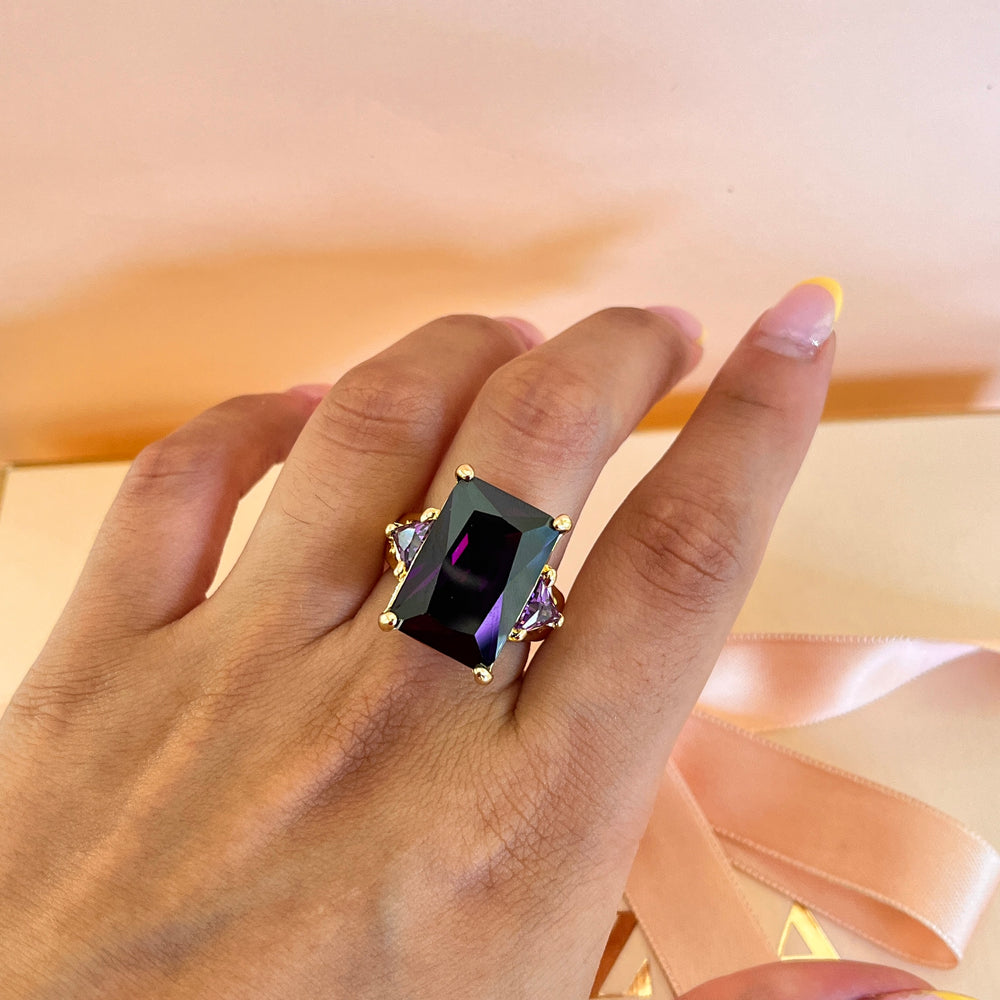 This purple rectangular ring is the perfect accessory for any occasion. With its purple rhinestone and rectangular shape, it adds a touch of elegance to any outfit. The adjustable and gold-plated design make it a versatile piece that can be worn on any finger. Elevate your style with this stunning ring!