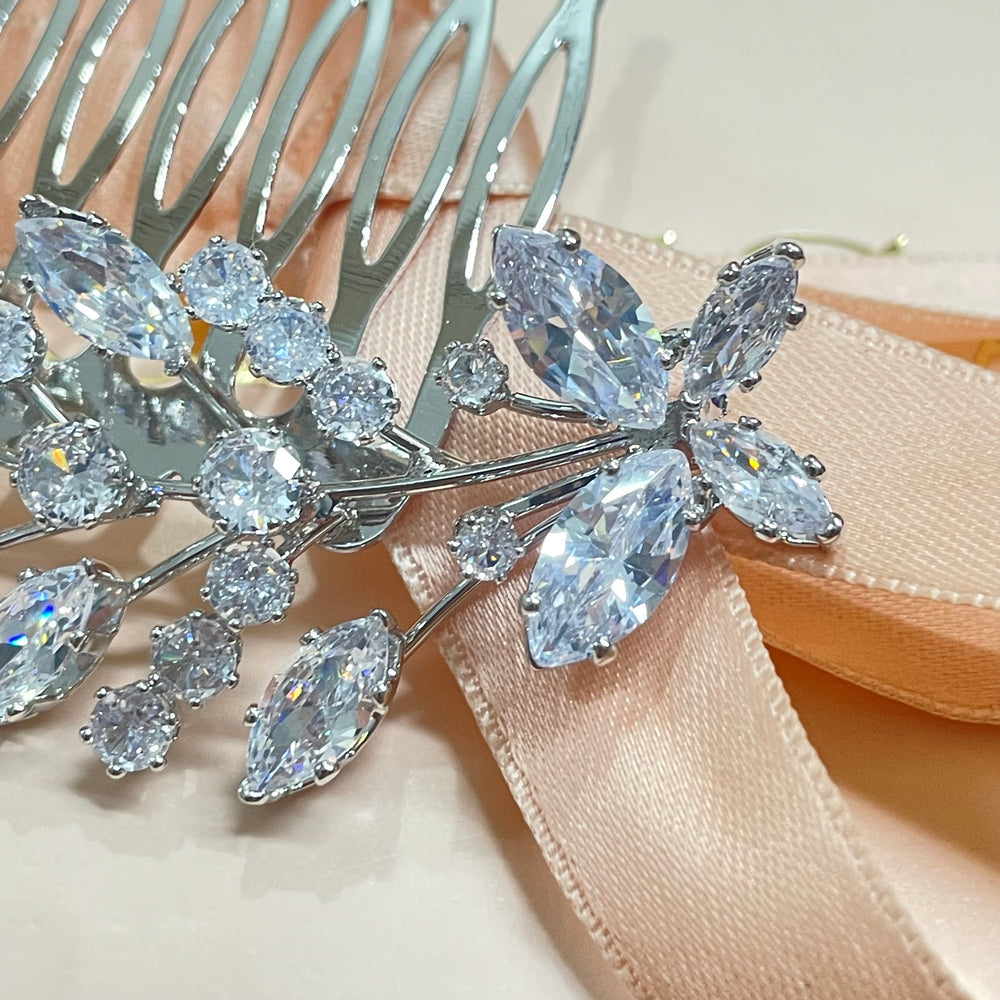 Introducing our Silver butterfly detail cubic zircone comb, a beautiful addition to any upstyle for special occasions. Its delicate butterfly accent adds a touch of elegance, completing your look with a touch of sparkle. Made with high-quality cubic zirconia for a stunning appearance.